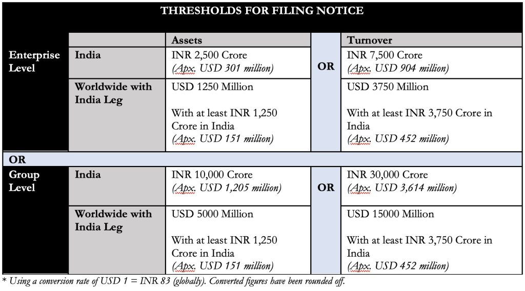 As per the Indian merger regime, Jurisdictional Thresholds have been provided at both, an enterprise level and a group level. If any of the Jurisdictional Thresholds (mentioned below) are met, a requirement to notify the envisaged transaction to the Competition Commission of India (“CCI”) for its approval will get triggered.