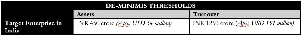 Transactions where the target enterprise either has assets or a turnover that is less than the De-minimis Thresholds (mentioned in the table below) are presently exempted from obtaining the CCI’s approval, for a period of two years (i.e. until 6th March 2026), even if the Jurisdictional Thresholds are met.