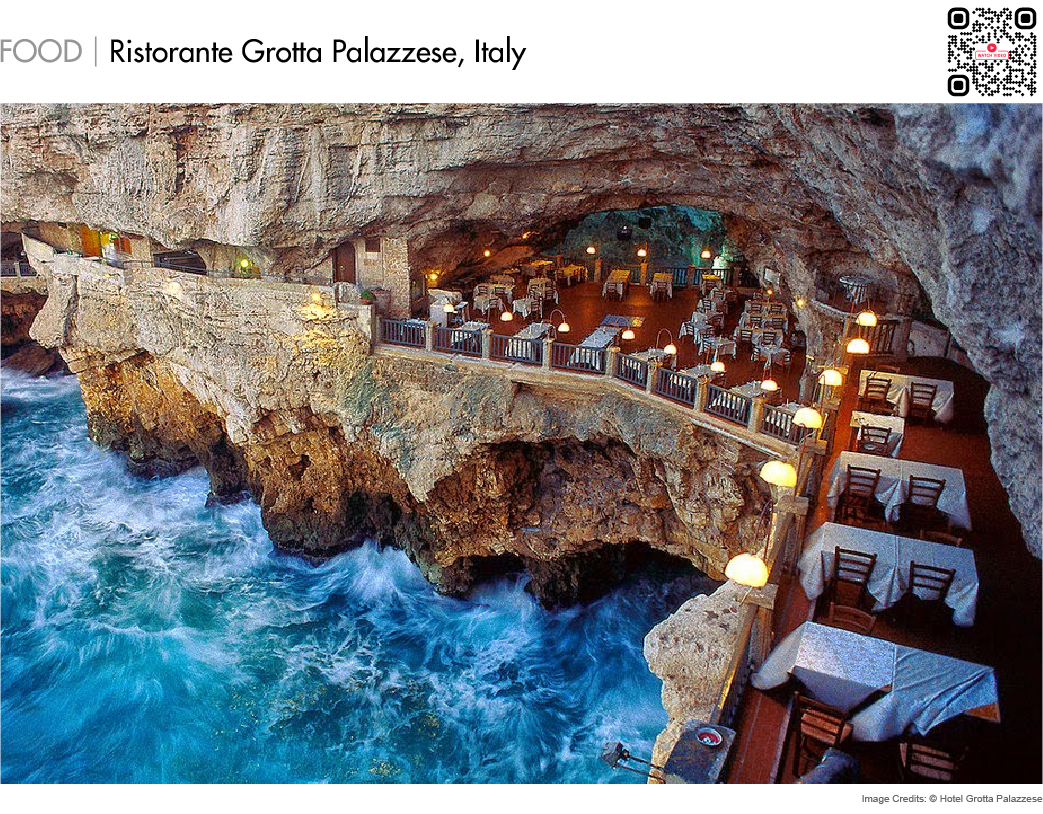 Ristorante Grotta Palazzese in Polignano a Mare, Italy, is a breathtaking cliffside dining experience carved into a natural sea cave. Originating as a banquet hall for nobility in the 1700s-as documented in a 1783 watercolor-it now offers elegantly lit tables suspended 74 feet above the Adriatic, with panoramic views of the coastline and mesmerizing sunset plays on rock walls.